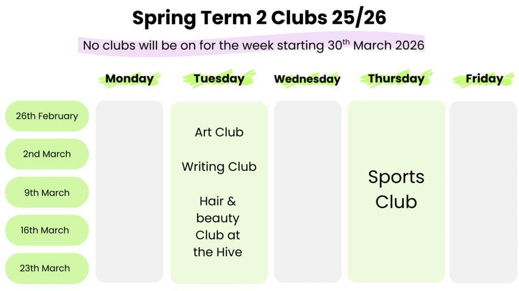 We also offer a range of lunchtime clubs throughout the week, giving pupils the chance to relax, socialise, and explore activities they’ve helped to choose through our pupil voice programme.