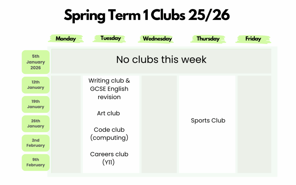 👉 Clubs subject to change on availability and number of students attending.