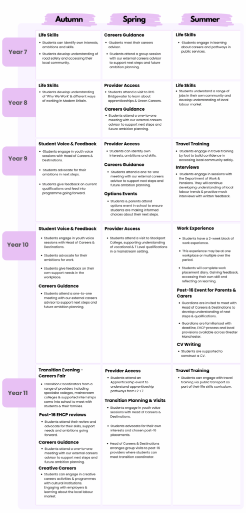 Through a structured blend of life skills, careers guidance, employer engagement, provider access and real-world experiences, students are supported to explore pathways, understand the labour market, and plan meaningful next steps. The overview below shows how careers learning is thoughtfully sequenced across the academic year and throughout each key stage.