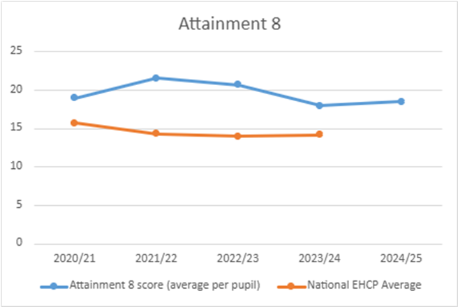 Pass rates at GCSE have fallen across the UK this year. With relatively small cohorts we should approach with caution when comparing one group of leavers’ results with another, particularly if the group cohort ability levels are different. We are pleased that our school’s Attainment 8 scores remain way above national independent SEND schools as below: