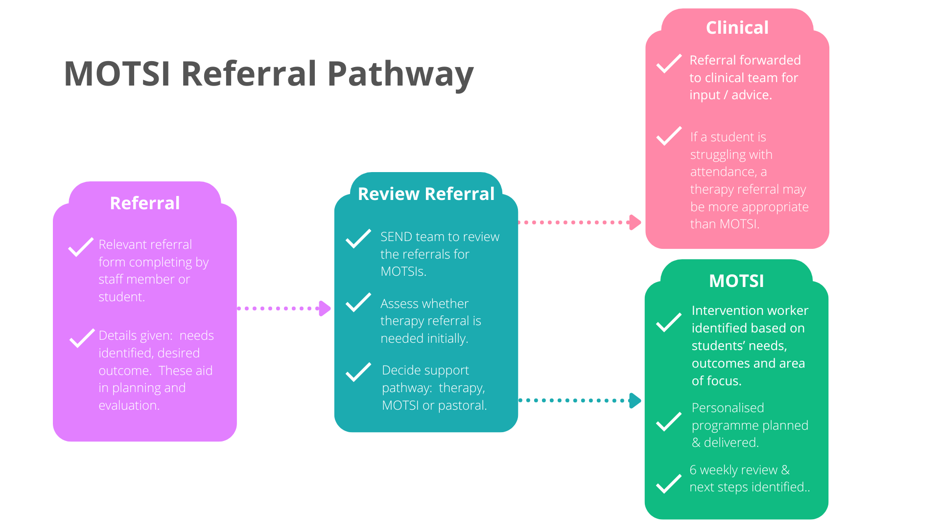 Our therapeutic curriculum, relational approach and personalised support ensure every pupil feels safe, welcomed and able to thrive. Most support is delivered through our whole school approach. However, some pupils may need extra help to fully access their curriculum or manage SEMH needs. When this happens, we provide enhanced and targeted interventions (MOTSI). This can include short-term interventions, therapy referrals or more specialist programmes.